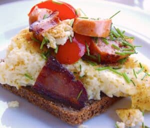 Som fyld på den klassiske udgave af æggepandekagen er stegt bacon, nogle pølser, friskklippet purløg og tomater et must. Og det smager himmelsk godt.