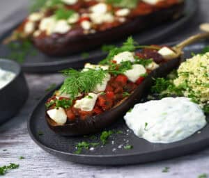 - Server de bagte auberginer i ovn til fx couscous vendt i persille, ris eller bulgur, og selvfølgelig masser af hjemmelavet tzatziki.