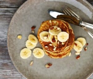 Opskriften på disse bananpandekager er uden mel og bagepulver, og er stort set fri for gluten.