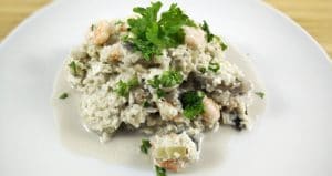 Blomkålsrisotto med rejer er rigtig nem at tilberede og i modsætning til den italienske risotto, er der ingen risiko for, at du ender med en klæg og klistret masse. Resultatet kan kun blive godt, hvis du følger min opskrift på blomkålsrisotto med rejer. Du kan evt. erstatte lidt af fløden med lidt hvidvin, for at tilføre lidt mere aroma til retten.