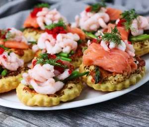 Butterdej med laks, rejer, blancherede grønne asparges og dildcreme er ikke kun en lækker forret, men også et perfekt kulinarisk indslag til påske- eller julefrokosten. Den lette og elegante kombination af smag og tekstur gør den til et ideelt valg til enhver festlig lejlighed, og er altid et stort hit når den er på menuen til påske- eller julefrokosten.