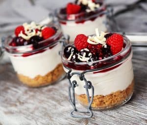 Denne opskrift på ostekage i glas med skovbærkompot er: