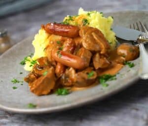 Her får du sprødstegte cocktailpølser, champignoner, løg og møre mørbradstykker, og ikke mindst en uimodståelig krydret paprika-flødesovs, som kan tryllebinde de fleste personer med hang til klassisk mormormad.