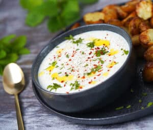 - Meget lig den tyrkisk inspirerede haydari-dip, men uden blendede ovnbagte peberfrugter