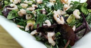 Synet, der ventede mig i køkkenet, bestod af en stor bunke grønt og et lille, diskret bæger med rejer i lage. Menuen denne aften skulle stå på forårssalat med rejer og mormordressing.