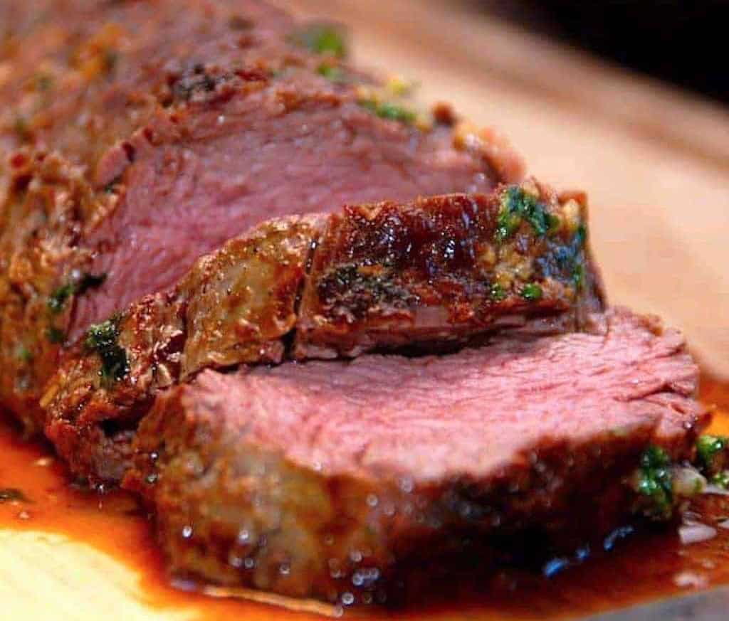 Så bliver det næsten ikke bedre: En hel oksemørbrad med persille og hvidløg, der er stegt grillen. Mørbraden kan dog sagtens også tilberedes i ovnen. Foto: Baregomad.dk.