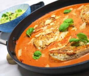 Saftigt kyllingebryst med lækker smagfuld stegeskorpe på spaophold i den mest cremede tomatflødesovs med frisk babyspinat, hvidløg og parmesan. Hurtig mundvandsdrivende aftensmad på blot 25 minutter, og med statsgaranti et hit for både store og små i familien. Denne opskrift på kylling i cremet tomatflødesovs er en af familiens nye favoritter, og kan serveres på en hverdagsaften eller som lækker gæstemad i weekenden. Det er hurtig og nem velsmagende aftensmad på under en halv time. Jeg er fan.