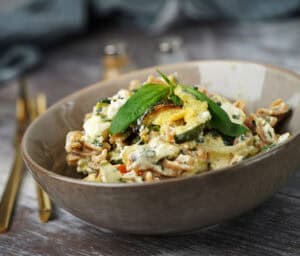 - Cremet pasta vendt i en lækker frisk dressing med citronskræl og frisk basilikum