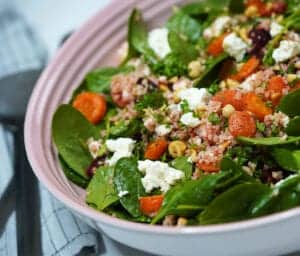 Jeg har valgt at kalde salaten for marokkansk salat med honningbagte rodfrugter, men i bund og grund er denne fyldige måltidssalat et sammensurium af lidt af det hele, og som kan varieres i det uendelige. Du kan både anvende bulgur, couscous, perlespelt, havrekerner og ris som det mættende element i salaten, som sammen med de lækre honningbagte gulerødder og rødbeder gør denne salat mundvandsdrivende lækker. Der sker altså bare et eller andet magisk med rodfrugter, når de bliver bagt i ovnen med lidt honning og olie. De ellers småkedelige rodfrugter får nyt liv takket være en tur i ovnen, og tilfører masser af smag til salaten med et diskret touch af kanel.