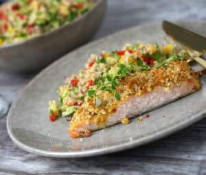 Stegte laksestykker i ovn med valnødde-crumble er sund og nem aftensmad for hele familien, som samtidig er antiinflammatorisk kost takket være de mange grøntsager i quinoa salaten, og ikke mindst de sunde omega-3 fedtsyrer i laksestykkerne og valnødderne. Omega-3 fedtsyrer er livsvigtige for kroppen, og findes i en lang række fødevarer som fx fisk, skaldyr, hørfrø, græskarkerner og valnødder. Jeg er svært begejstret for disse sprødstegte laksestykker i ovn, som bliver løftet til nye kulinariske højder takket være den sprøde valnødde-crumble, som sætter prikken over i'et rent smagsmæssigt.